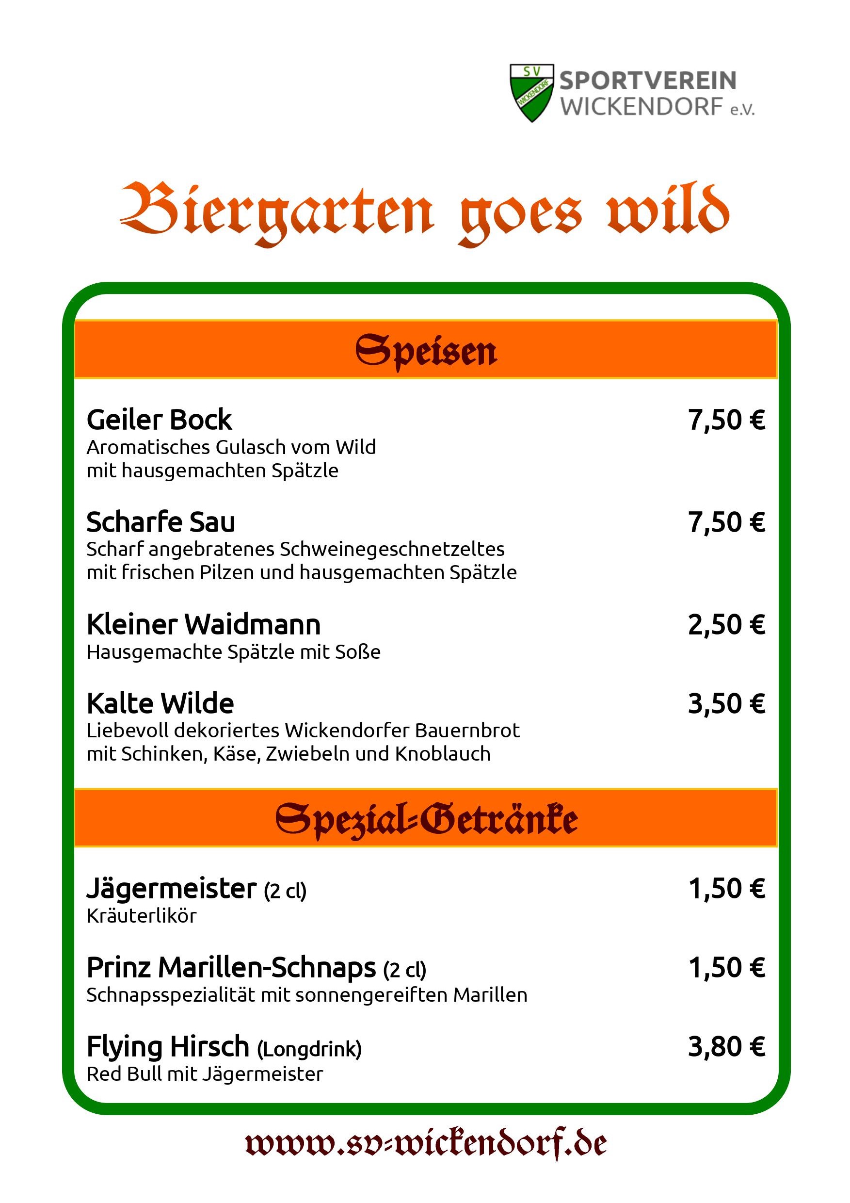 Der Biergarten beim SV Wickendorf geht in die dritte Runde: „Biergarten goes wild“ heißt es am Samstag, 18. Juli, ab 17:00 Uhr im Außenbereich des Sportheims, natürlich unter Berücksichtigung der geltenden Vorschriften.